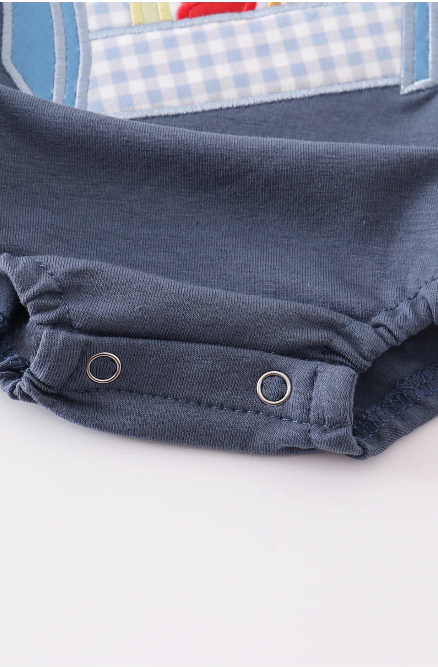 Unleash your little handyman with this navy toolbox applique boy bubble! Featuring a toolbox applique that's sure to put a smile on your little guy's face, this bubble is made of soft, breathable cotton for maximum comfort. Your mini-me will be looking sharp and feeling comfy in this stylish and practical piece!